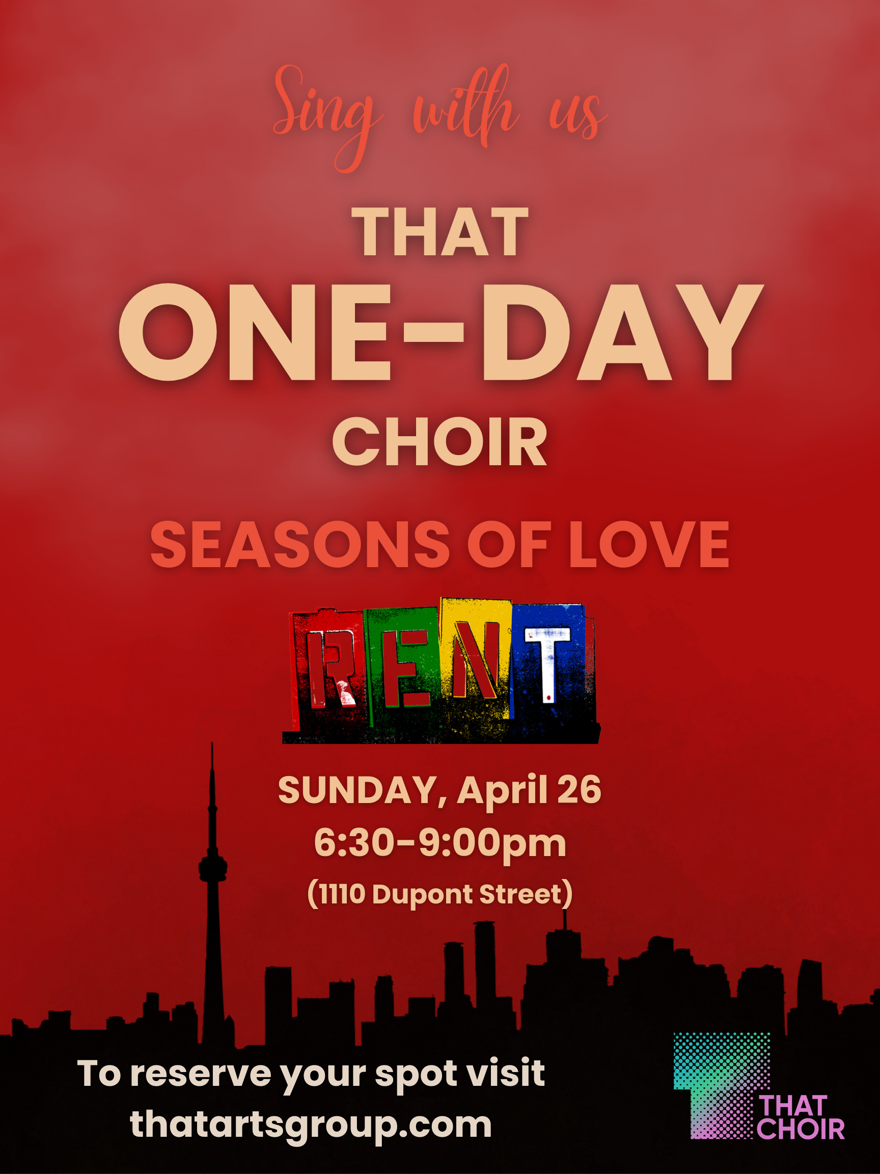 In a single day, we’ll learn Seasons of Love from Rent, meet new people, and build the kind of community That Arts Group is all about: inclusive, relaxed, and connected through song.