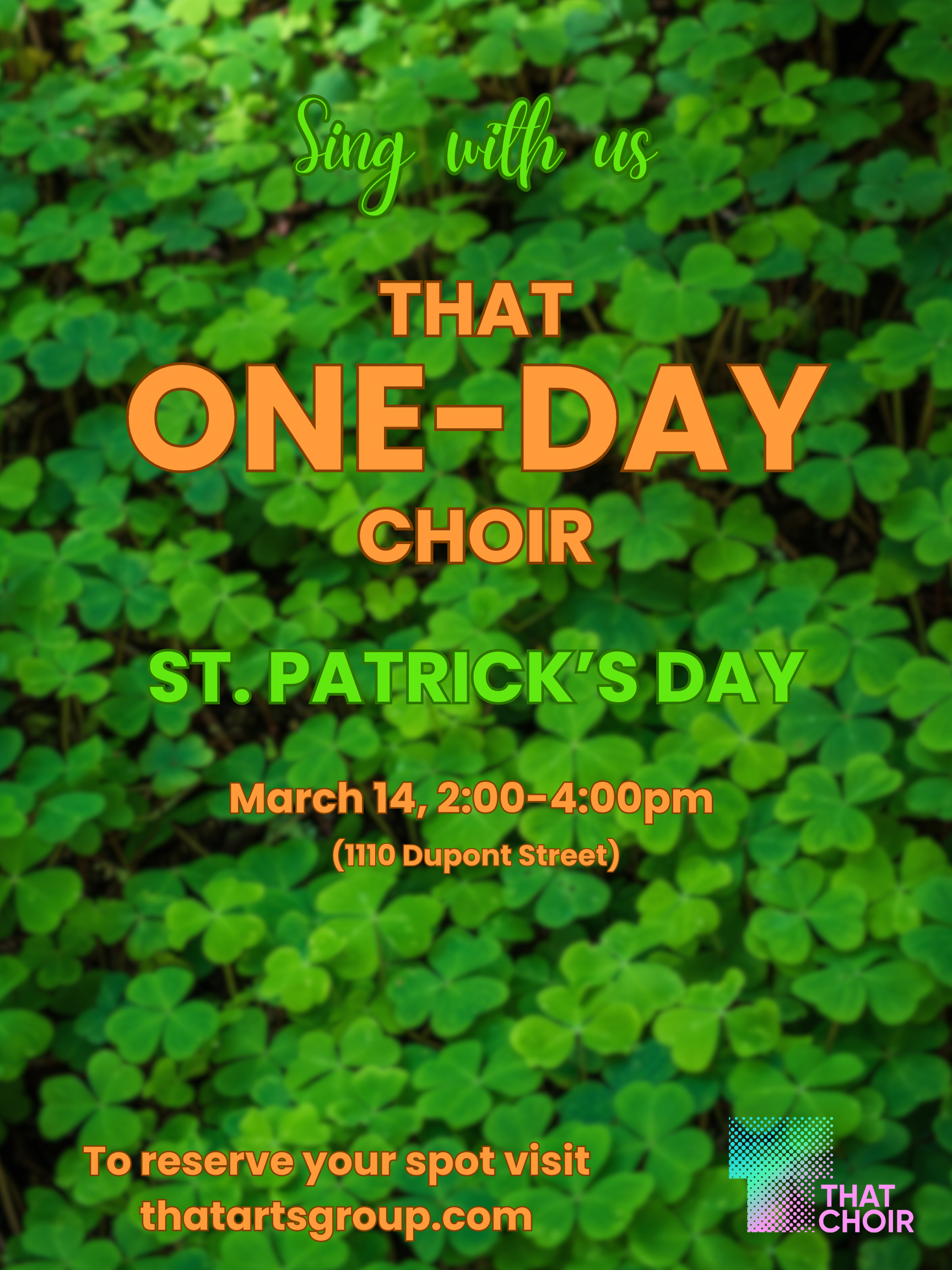 That Arts Group is hosting another One-Day choir event celebrating St. Patrick’s Day. Come sing with us as we work together with artistic director Craig Pike to learn our classic arrangement of Danny Boy!